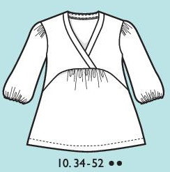 Tunique manches 3/4, col V croisé. Fronces aux emmanchures et sur le haut de la jupe devant et dos. Pinces à l’encolure dos. Bas des manches élastiquées.
