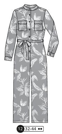 Combinaison à manches longues avec fente, pli et bouton aux poignets. Pinces poitrines et dos, poches à rabat plaquées devant, poches aux hanches. Empiècement dos, col mao, boutonnage devant et ceinture à la taille