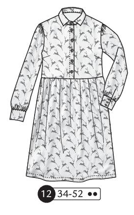 Robe courte manches longues avec fente, fronces et boutons aux poignets. Jupe froncée, pinces poitrine et épaules dos. Boutonnage haut devant et col avec pied de col.