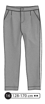 Pantalon à plis devant, braguette et bouton à la ceinture. Poches aux hanches, bandes le long des jambes sur les côtés, taille élastiquée au dos, poche passepoilée au dos.