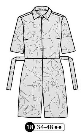 Combishort en coton avec pinces poitrine, taille haut et pantalon dos, poches aux hanches. Manches courtes, fermeture invisible devant et ceinture à nouer.
