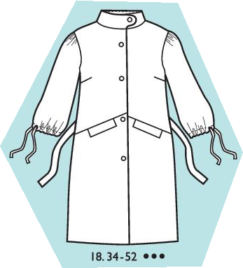 Manteau léger de mi saison avec manches froncées et élastiquées en bas avec lien de serrage. Pinces poitrine, col droit avec bouton pression, empiècement devant avec poches à rabat prise dedans. Pressions devant et ceinture à nouer.