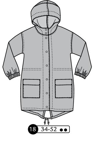 Veste de pluie avec capuche, manches élastiquées aux poignets, lien en bas avec découpe V au bas du dos. Lien pour resserrer à la taille, poches plaquées avec rabat devant et boutonnage devant