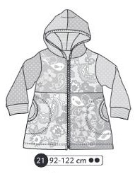 21-Happy Combo 10 décembre 2025 Sweat avec capuche et poches. Découpes devant et dos et bracelets aux poignets. Fermeture devant Disponible en 92-98-104-110-116-122 cm 06/2014 Précédent 20-Winter Pull-Ons Plus récent 23-Blue Monday