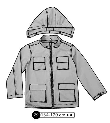 Manteau en coton extérieur avec capuche amovible, manches en 2 pièces, poches à soufflets et rabats sur le devant. Empiècement dos, patte de serrage en bas de manches et fermeture éclaire devant