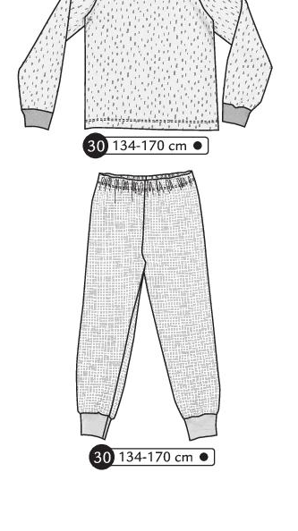 Pyjama avec pantalon taille élastiquée, bord côte aux chevilles. Haut manches longues raglans avec pinces aux épaules, bord côte aux poignets et encolure