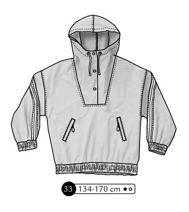 33-Wind Shield 10 décembre 2025 Anorak à enfiler par la tête avec capuche, ceinture et poignets élastiqués. Poches zippées devant et boutonnage au niveau de la capuche Disponible en 134-140-146-152-158-164-170 cm 04/2021 Précédent 32-Sprinting Plus récent 34-Cosy Feeling