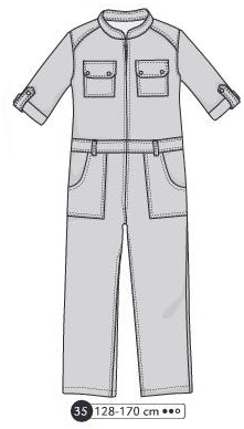 Combinaison manches 3/4 en jeans. Pattes en bas des manches, poches plaquées aux hanches, poches plaquées à rabat devant, empiècement dos et poches plaquées au dos. Fermeture invisible devant
