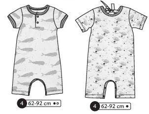 Combinaison courte à manches courtes. Patte de boutonnage devant ou pas selon option choisie. Liens à nouer dans le haut du dos avec découpe ou pas selon option. Pressions entrejambe. S’enfile par la tête