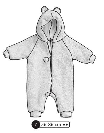 7-Furry Friends 10 décembre 2025 Combinaison pilote manches raglans avec capuche et oreilles dans les pinces. Poignets et bracelets de cheville en bord côte. Fermeture éclaire devant Disponible en 56-62-68-74-80-86 cm 06/2018 Précédent 6-First Cold Days Plus récent 8-Baby Bear