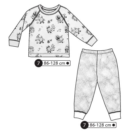 Pyjama avec pantalon taille élastiquée, bord côte aux chevilles. Haut avec manches longues raglans et pinces sur les épaules. Bord côte aux poignets et encolure