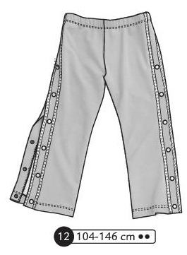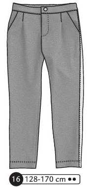Pantalon à plis devant, braguette et bouton à la ceinture. Poches aux hanches, bandes le long des jambes sur les côtés, taille élastiquée au dos, poche passepoilée au dos.