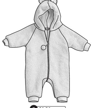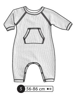 Combinaison manches raglans, poche kangourou plaquée devant, pressions à l’entrejambe. S’enfile par la tête