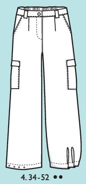 Pantalon cargo avec plis devant, poches aux hanches, poches à plis creux et rabats sur le côté des jambes, braguette et bouton à la ceinture. Taille élastiquée au dos et boutons pressions aux chevilles pour resserrer le bas.