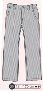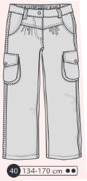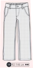 Pantalon en sergé ou jeans, braguette et bouton à la ceinture, empiècements dos et poches plaquées arrondies