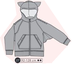 Sweat manches raglans et capuche. Bord côte aux poignets et ceinture. Forme aile au dos et aisselles, oreilles sur la capuche. Fermeture devant