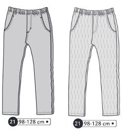 Pantalon ou jeans avec plis au genoux, poches aux hanches avec découpe, empiècements au dos et poches plaquées avec découpes au dos. Braguette et bouton à la ceinture