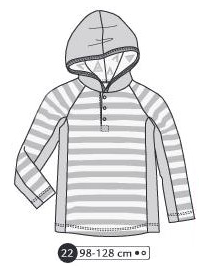 Tee shirt à capuche et manches longues raglans. Empiècement sous le bras et les côtés, patte de boutonnage devant