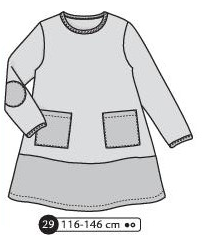 Robe courte manches longues. Découpe en bas de la robe devant et dos. Poches plaquées devant et empiècement aux coudes