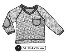Pull en maille, manches raglans et col V. Empiècement aux coudes et poche arrondie plaquée devant. Fente en bas des côtés