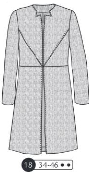 Veste longue avec encolure forme géométrique, pinces aux manches et découpes devant. Se ferme avec des agrafes