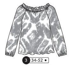 Blouse avec manches longues raglans élastiquées en bas, encolure élastiquée permettant de poser sur le haut des bras ou les épaules selon le rendu souhaité