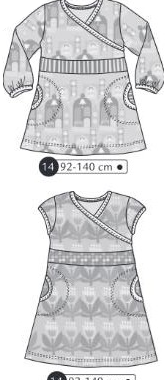Tunique ou robe, manches 3/4 ou courtes. Ceinture et poches, haut croisé sur le cœur.