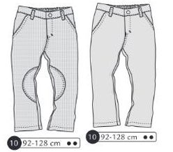 Pantalon avec ou sans empiècements aux genoux, braguette et bouton à la ceinture, poche passepoilée au dos et taille élastiquée au dos