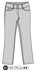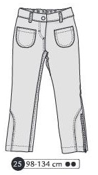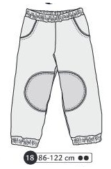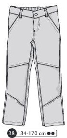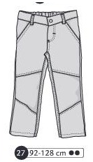 Pantalon jeans avec empiècements aux genoux, poches aux hanches, poches plaquées au dos. Braguette et bouton à la ceinture, taille élastiquée au dos
