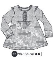 Tunique manches longues et volants, jupe froncée devant et dos. Fausse patte de boutonnage et froufrous autour.