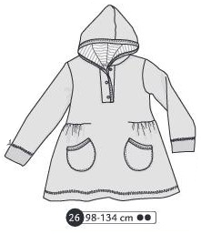 Tunique à manches longues et capuche. Patte de boutonnage devant, poches plaquées et fronces sur les 2 côtés à la taille