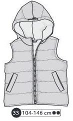 Manteau matelassé sans manche avec capuche. Poches à revers et fermeture devant.