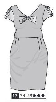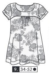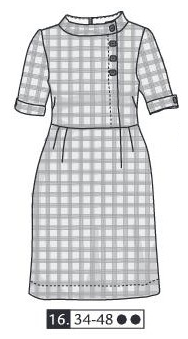 Robe courte en manches courtes, revers en bas des manches et col droit. Fausse patte de boutonnage sur le côté gauche du corsage, fermeture invisible dans le dos
