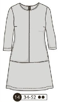 Robe courte manches 3/4, pinces poitrine, coudes et encolure dos, découpe devant et dos. Poches dans les coutures des côtés, fermeture invisible au dos
