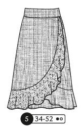 Jupe mi longue à pans croisés devant et volant au bord. Pinces au dos, fermeture invisible et boutons au dos