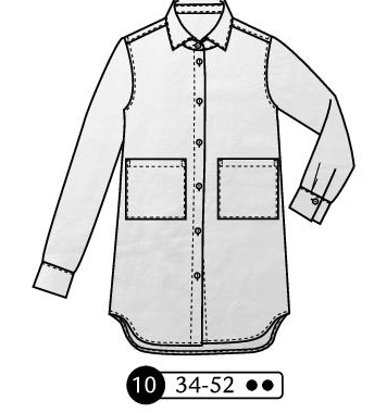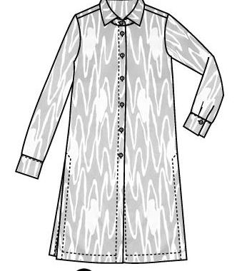 Chemisier long à manches longues, fente, pli et bouton au poignet. Poches plaquées devant, col avec pied de col et boutonnage devant. Fronces au dos sous l’empiècement