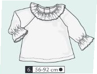 Blouse à volant à l’encolure et manches longues raglans resserrées au 3/4. Boutonnage dans le dos sur toute la hauteur