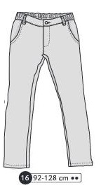 Pantalon de velours ou jeans avec empiècement arrondi au dos et passepoil, poches plaquées. Braguette et bouton à la ceinture, poches aux hanches. Taille en partie élastiquée