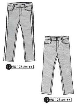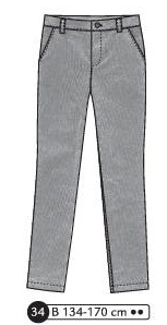 Pantalon avec ou sans bande sur les côtés des jambes, braguette et bouton à la ceinture. Poches aux hanches, empiècements et poches plaquées au dos