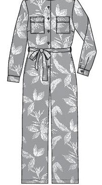 Combinaison à manches longues avec fente, pli et bouton aux poignets. Pinces poitrines et dos, poches à rabat plaquées devant, poches aux hanches. Empiècement dos, col mao, boutonnage devant et ceinture à la taille