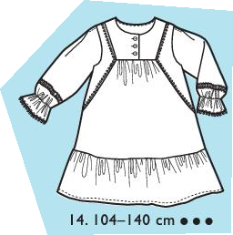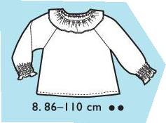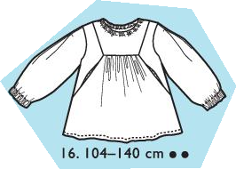 Blouse en coton avec poignet et encolure élastiquées. Empiècements dos et devant avec poches cachées dedans sur le devant. Fronces de la jupe. Manches longues avec plis sur le haut de l’emmanchure.