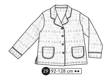 Haut de pyjama manches longues avec poignets, passepoil au col et devant. Poche plaquée devant par 1 ou 2 selon le modèle. Fente en bas des côtés, boutonnage devant
