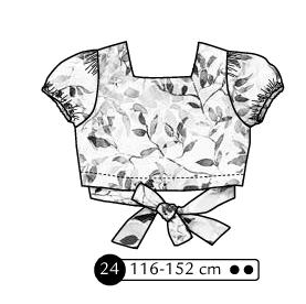Haut court en coton croisé dans le dos, manches courtes froncées et élastiquées en bas. Encolure carrée devant, pinces dans le dos avec nœud à nouer pour fermer