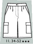 Bermuda avec poches aux hanches et poches plaquées à rabat sur les côtés des cuisses. Plis devant et poches passepoilées au dos. Braguette et bouton à la ceinture