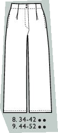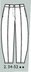 Pantalon large effet « ballon » légèrement raccourci. Pinces et poches passepoilées au dos, poches aux hanches dans la couture de côté. Braguette et bouton à la ceinture