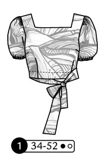 Haut court croisé dans le dos en coton, manches courtes froncées sur le haut de l’emmanchure et élastiquées en bas des manches. Encolure devant carrée. Pinces poitrine, en bas devant et au dos. Ceinture nouée.