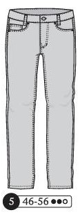 Jeans avec braguette et bouton à la ceinture, poches aux hanches. Empiècements au dos et poches plaquées au dos