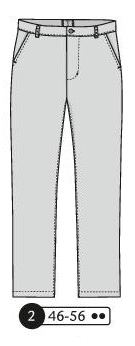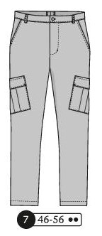Pantalon avec poches aux hanches, poches à plis avec rabat sur les côtés, braguette et bouton à la ceinture. Empiècements et poches plaquées au dos