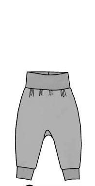 Pantalon type sarouel sans couture de fourche. Ceinture en bord côte. Avec ou sans pieds selon l’option choisie