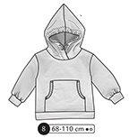 Sweat à capuche, resserrée sur le haut. Bord côte à la ceinture et aux poignets. Poche kangourou devant. Option manches droites ou froncées au niveau des poignets